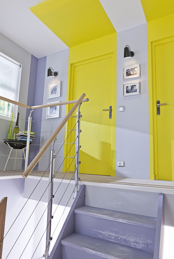 Comme l’entrée, les couloirs sont vite les laissés pour compte de la maison. Pourtant, bien plus que des lieux de passage, ils sont de véritables transitions entre les autres pièces et ne peuvent souffrir d’être insipides. La bonne idée de Leroy Merlin ? Leur donner de l’éclat grâce à des couleurs qui ne laissent pas de marbre. La règle étant souvent de fondre les portes dans le décor, on a ici souligné leurs encadrements du sol au plafond de la même couleur qu’elles. Quant aux recoins du couloir, c’est une autre bande de couleur qui vient les mettre en valeur. En plus de donner du relief à l’espace, on gagne vraiment en chaleur.