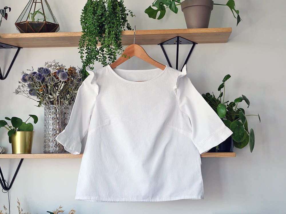 Si j’ai encore doublé les volants d’épaules, je n’ai cette fois pas oublié de mettre 3 cm pour la marge de couture du bas. Au final, la blouse est vraiment très agréable à porter ! Et ne se froisse pas le moins du monde…