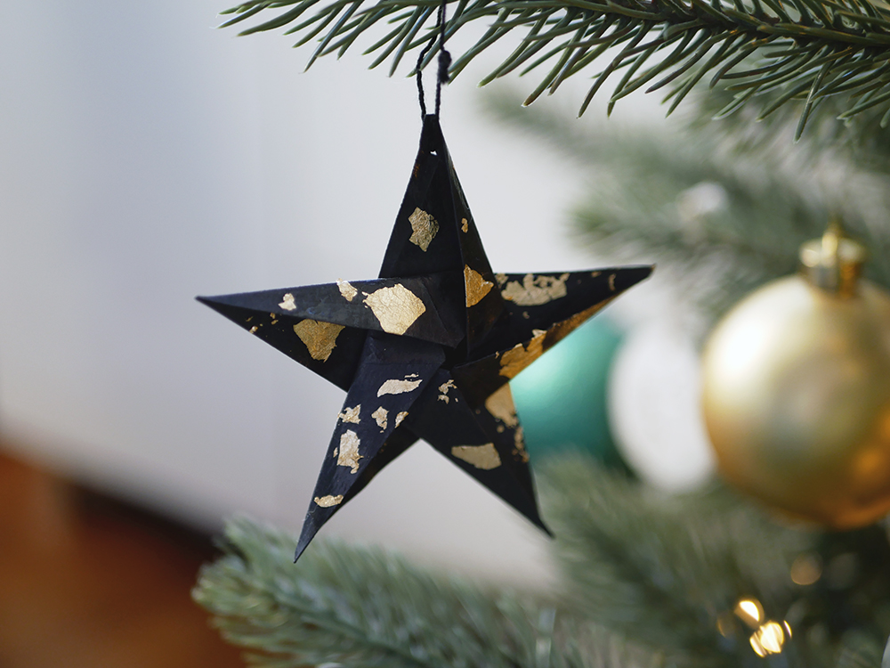 Une fois les étoiles pliées, j’ai délicatement collé des paillettes métallisées (ça ressemble à de la feuille d’or, version pas chère ^^) avec de la colle vinylique et un pinceau. Un coup de poinçon dans un branche pour faire un trou, et il ne reste qu’à y glisser le fil pour suspendre l’étoile au sapin.