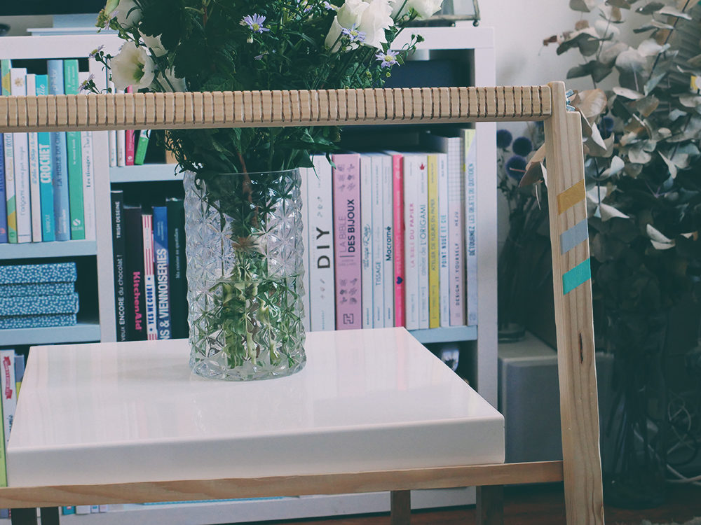 Pour la finition, j’ai utilisé de la peinture acrylique Cultura et du masking tape. Avec ceux-ci, j’ai pu dessiner de petites bandes de couleur. Ça donne un petit effet entre le boho et le scandinave qui me plaît tout à fait !