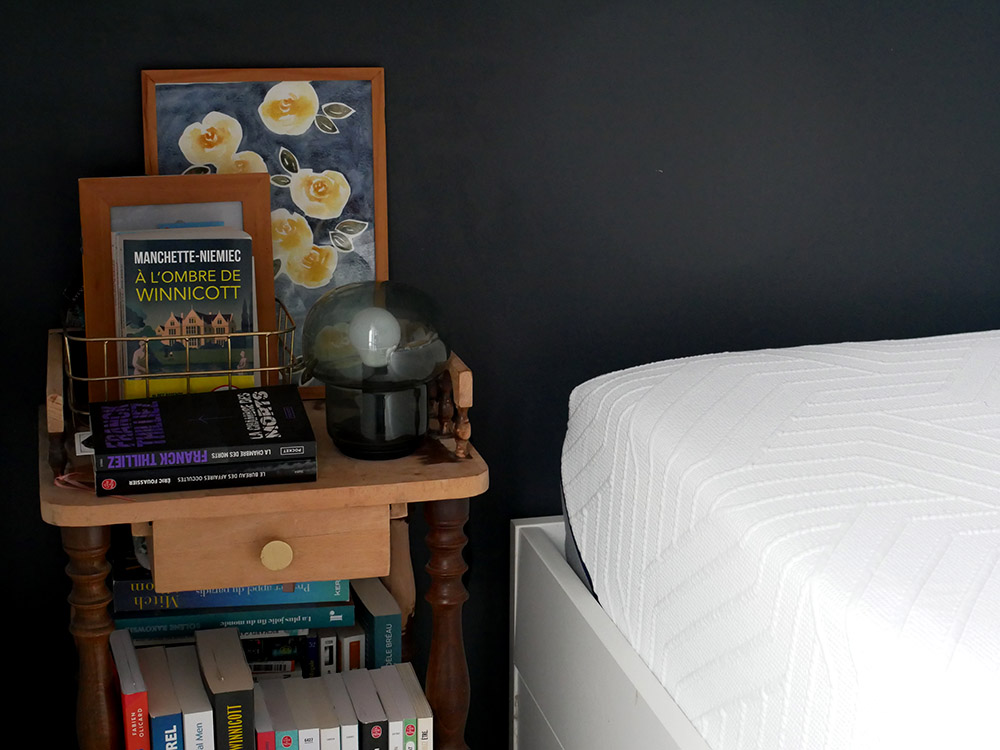 Mon premier gros coup de coeur va à la chambre parentale, avec son lit très attirant. J’aime tout particulièrement l’accumulation de coussins aux couleurs, motifs et textures variés. Avec ce bleu envoûtant, le camaïeu de gris est mis en valeur et ça fait du bien de voir de telles couleurs ! Ça nous change agréablement du blanc et des couleurs pastel ultra-présents en ce moment dans la déco. Je suis fan et ambitionne désormais à créer le même résultat chez moi.