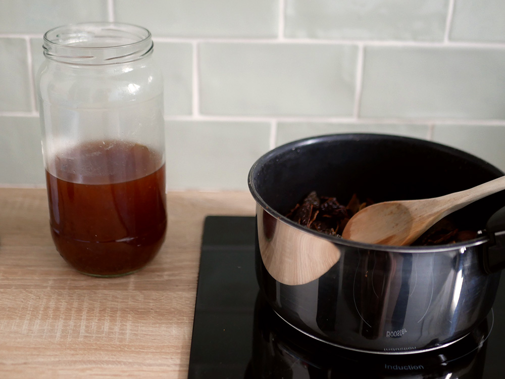 Une fois la décoction terminée, au bout d’une bonne heure, on la retire du feu pour la filtrer.