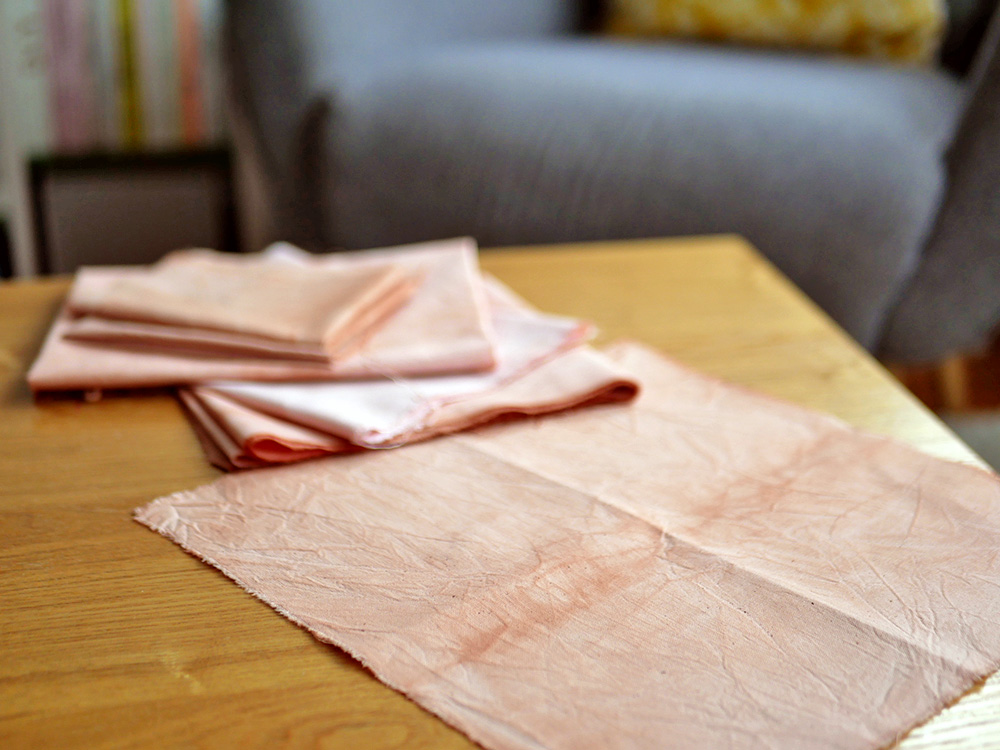 J’ai testé de rincer à l’eau un des tissus (en bas à droite) avant de l’essorer, ça a atténué sa couleur (c’est joli aussi !). [note : voir plus bas pour plus d’infos sur ce point !]