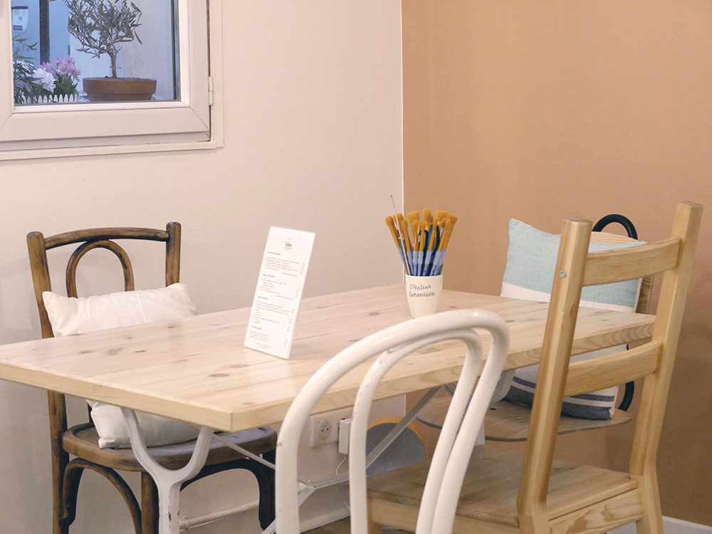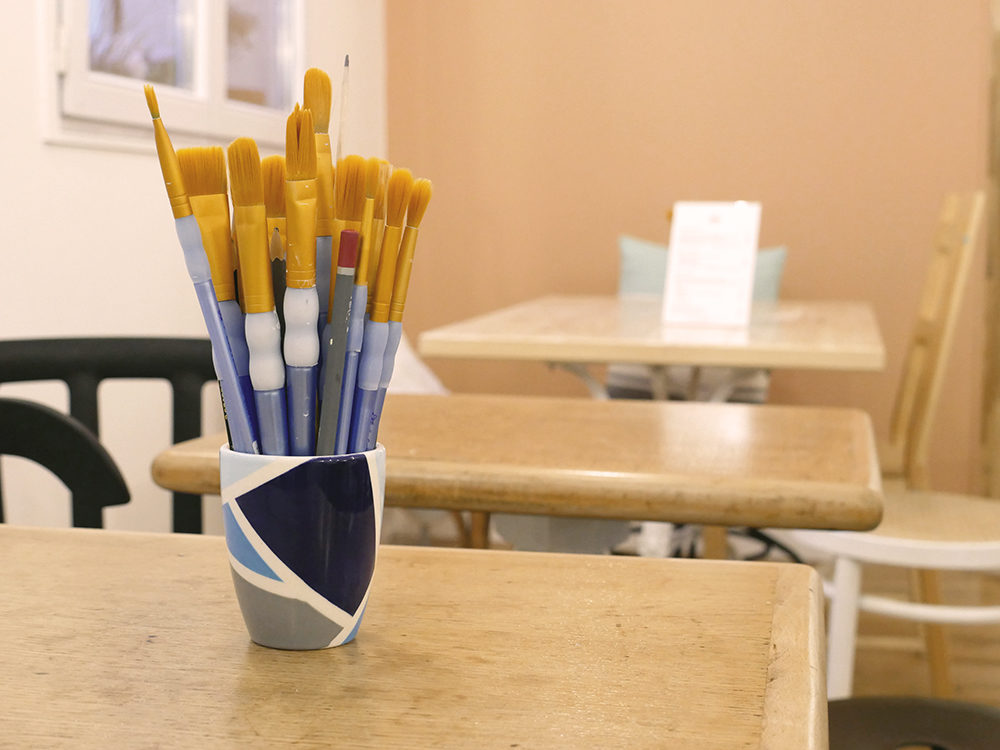 Deux espaces lavabos et étagères remplies de pots de peinture rappellent que l’on ne se trouve pas uniquement dans un café/bar mais avant tout dans un lieu de création ! Sur les tables, des pots remplis de pinceaux complètent le tableau de ce céramicafé.