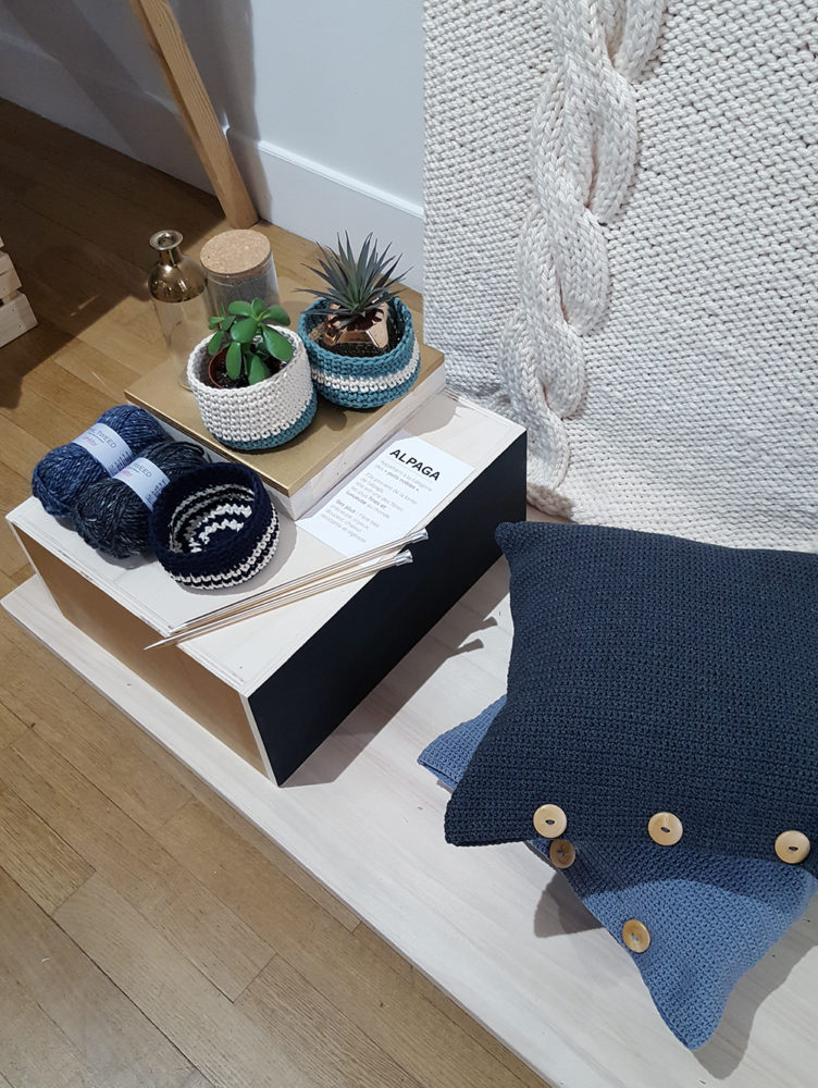 Le pressday était également l’occasion pour moi de rencontrer Caro, du blog Caro Tricote. En plus de beaucoup aimer son univers que je suis sur Instagram, c’est elle qui, indirectement, m’a poussée à me mettre au crochet (l’histoire ICI). Nous avons réalisé une déco murale avec des laines texturées. J’ai évidemment opté pour du moutarde, avec de l’anthracite et du (presque) blanc. Je ne l’ai pas encore prise en photo, mais voici un aperçu de l’atelier. C’était très inspirant, et j’ai adoré l’idée d’utiliser une aiguille en bois de rose à la place d’une simple baguette ou d’une branche !