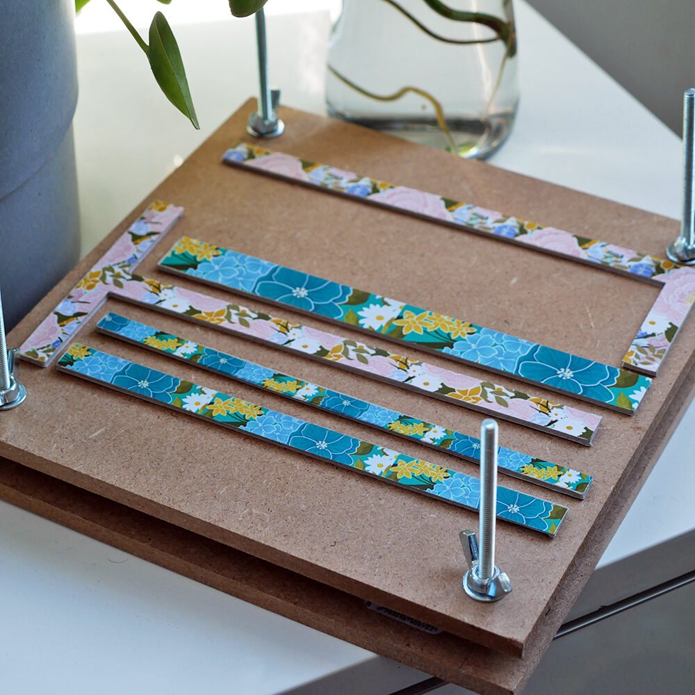 Comme à chaque fois que je débute l’apprentissage d’une nouvelle technique créative, j’essaye de m’appuyer sur ce que j’ai dans mes placards, ou que je peux fabriquer moi-même. C’est ainsi que j’ai fait mes premières règles et guides de reliure par mes propres moyens. La première version, c’était dans une sorte de plastique souple polypropylène découpé à la Cricut. Si l’idée était intéressante, le résultat n’était clairement pas assez solide ! J’ai donc réitéré dans du carton épais, toujours détaillé à la Cricut, que j’ai décoré d’autocollants sur-mesure…