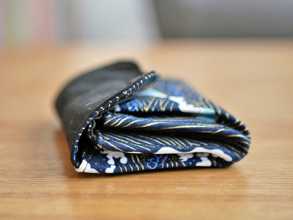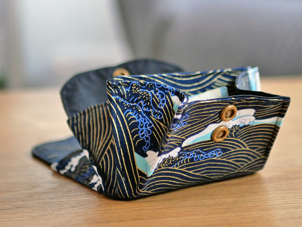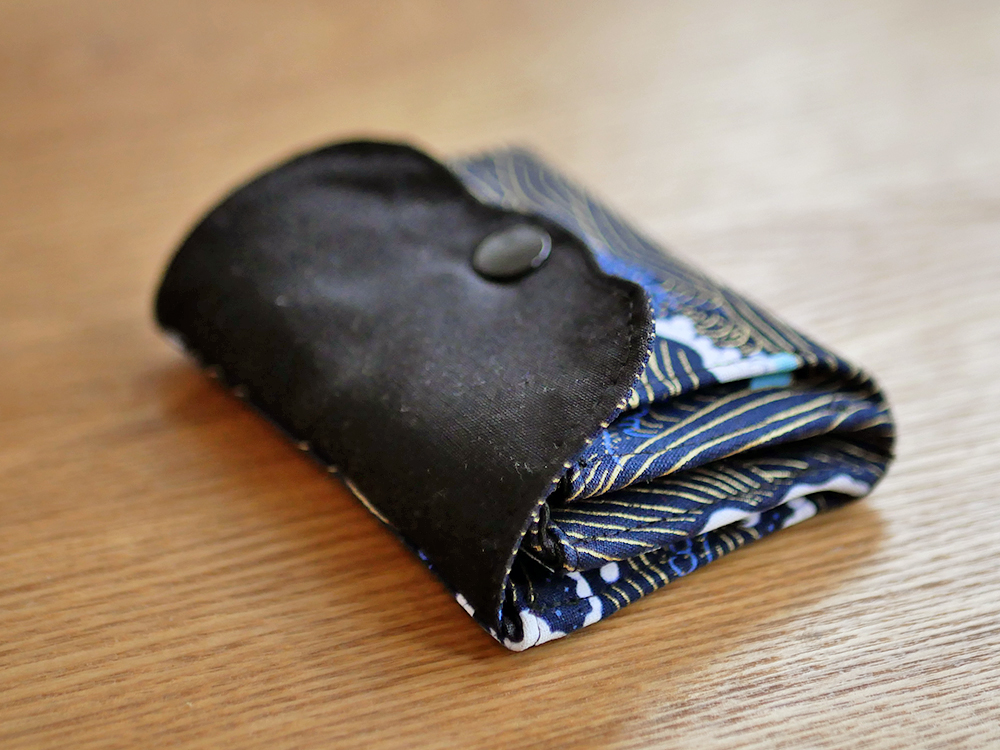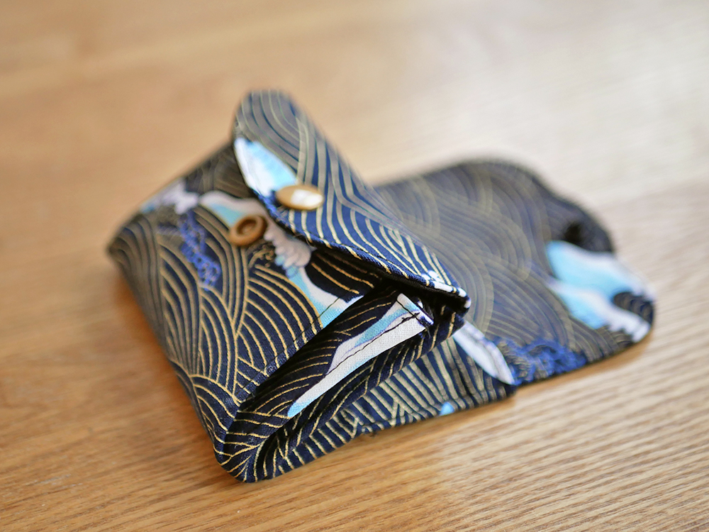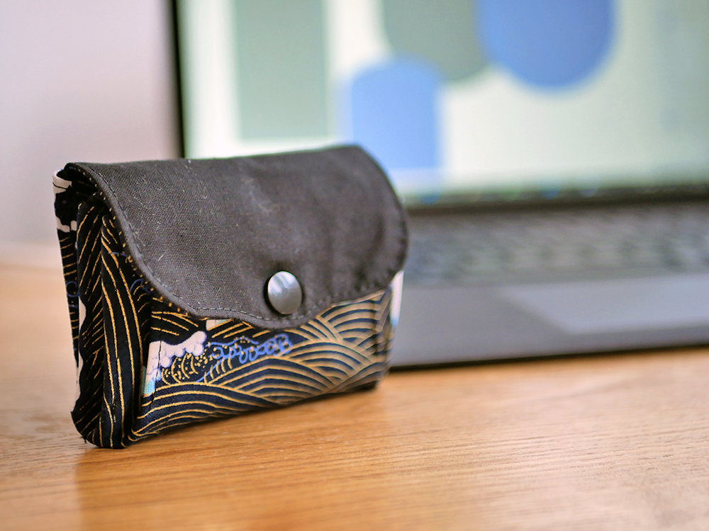 Il est temps de vous présenter mon porte-monnaie à soufflets. Il a été réalisé en suivant les indications de la vidéo et mon adaptation du patron. D’une part, j’ai choisi une chute de coton noir qui traînait dans un coin et un reste de thermocollant. D’autre part, j’ai opté pour un superbe tissu imprimé inspiré de La Grande Vague de Kanagawa. Pour les fermoirs, je ne me suis pas embêtée : des pressions en plastique pour la noire et dorées de Prym pour les autres.